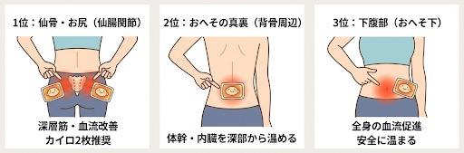 「どこに貼れば一番効率よく温まるのか?」 解剖学の知識に基づき、太い血管と筋肉の交差点となるベストポジションを3つご紹介します。