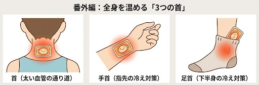 - 足首(あしくび): ここが冷えると、どれだけ腰を温めても効果が半減します。厚手の靴下やレッグウォーマーでガードしましょう。