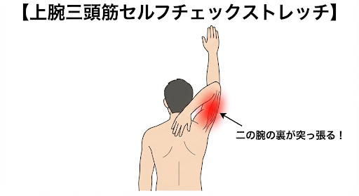 • もし、肘が曲がりきらない、あるいは二の腕の裏や脇の後ろが突っ張って痛い場合は、上腕三頭筋長頭が硬くなっているサインです。