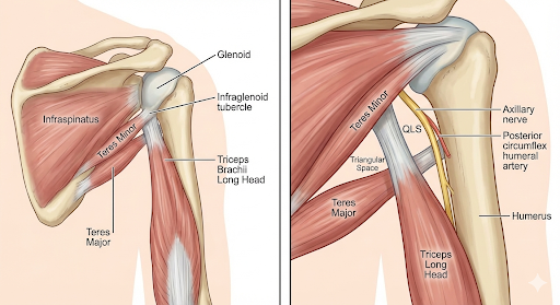 肩の後ろ側には、小円筋(Teres Minor)と大円筋(Teres Major)という筋肉が横に走っています。