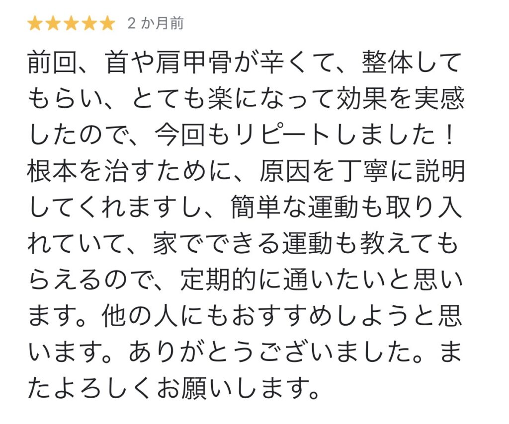 「前回、首や肩甲骨が辛くて、整体してもらい、とても楽になって効果を実感したので、今回もリピートしました!根本を治すために、原因を丁寧に説明してくれますし、簡単な運動も取り入れていて、家でできる運動も教えてもらえるので、定期的に通いたいと思います。他の人にもおすすめしようと思います。ありがとうございました。またよろしくお願いします。」